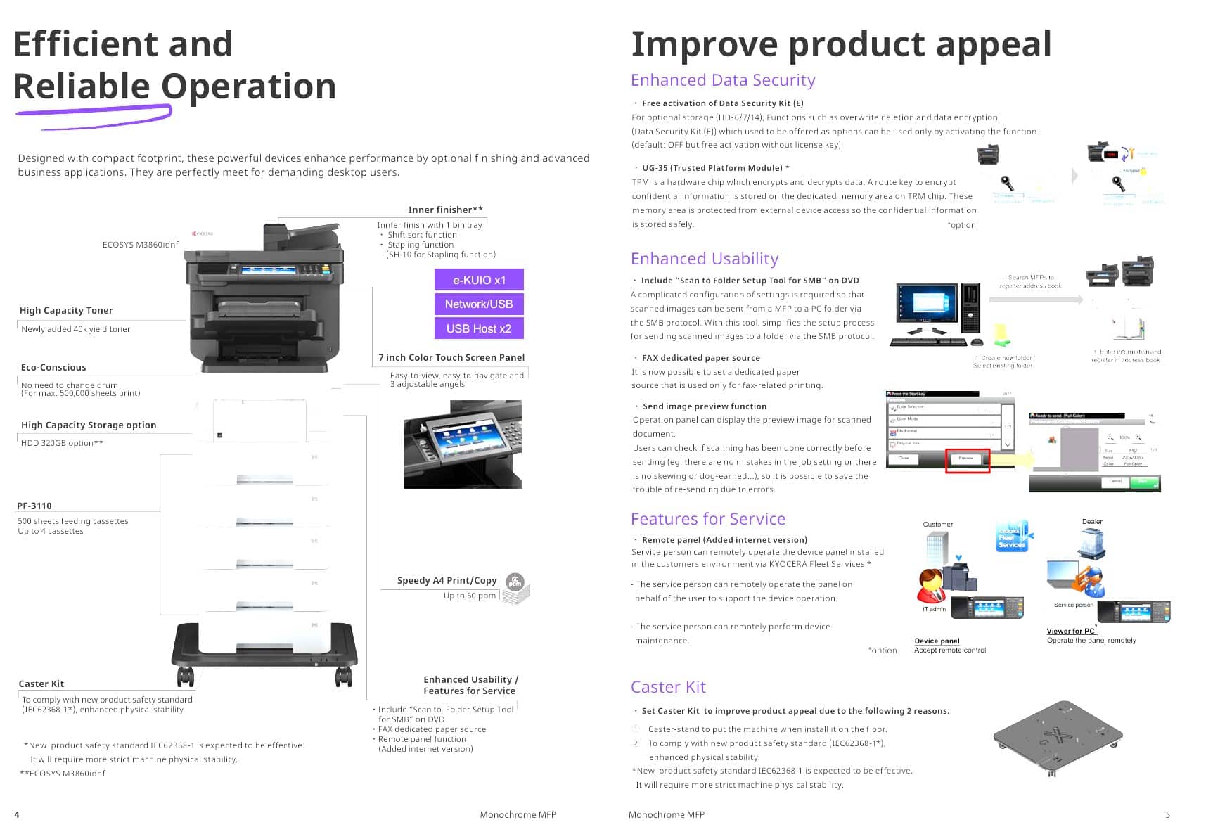 The ECOSYS M3860idn features Kyocera’s patented long-life drum technology and separate toner cartridges, minimizing waste and reducing operating costs. It is an Energy Star® certified device, supporting your business’s sustainability initiatives.