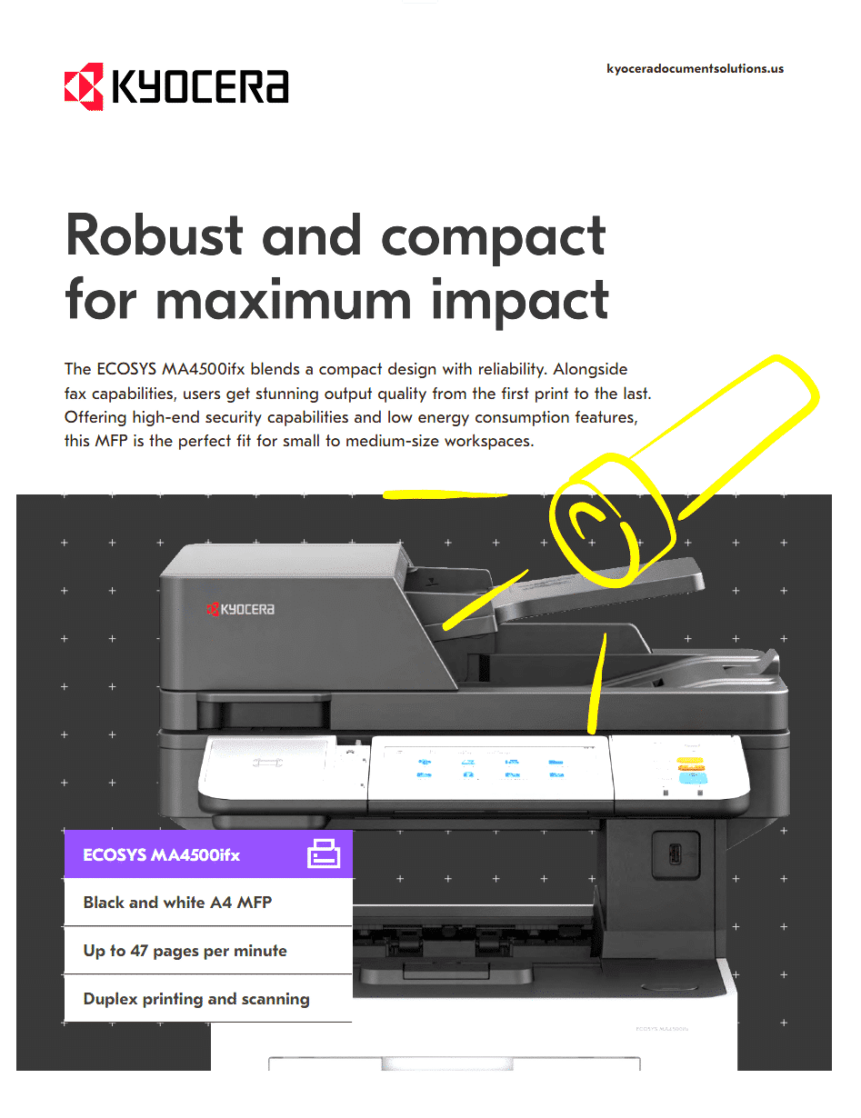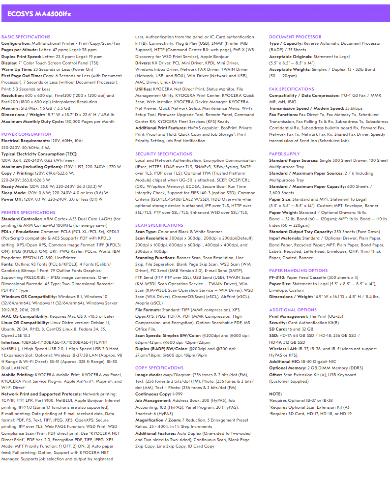 The Kyocera ECOSYS MA4500ifx is the perfect solution for businesses seeking a reliable, secure, and eco-friendly multifunction printer. Its robust design, advanced features, and superior performance make it a valuable asset for modern office environments.