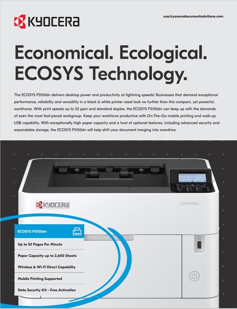 The KYOCERA ECOSYS P3150dn delivers desktop power and productivity at lightning speeds! Businesses that demand exceptional performance, reliability and versatility in a black & white printer need look no further than this compact, yet powerful, workhorse. With print speeds up to 52 ppm and standard duplex, the ECOSYS P3150dn can keep up with the demands of even the most fast-paced workgroup. Keep your workforce productive with On-The-Go mobile printing and walk-up USB capability. With exceptionally high paper capacity and a host of optional features, including advanced security and expandable storage, the ECOSYS P3150dn will help shift your document imaging into overdrive.