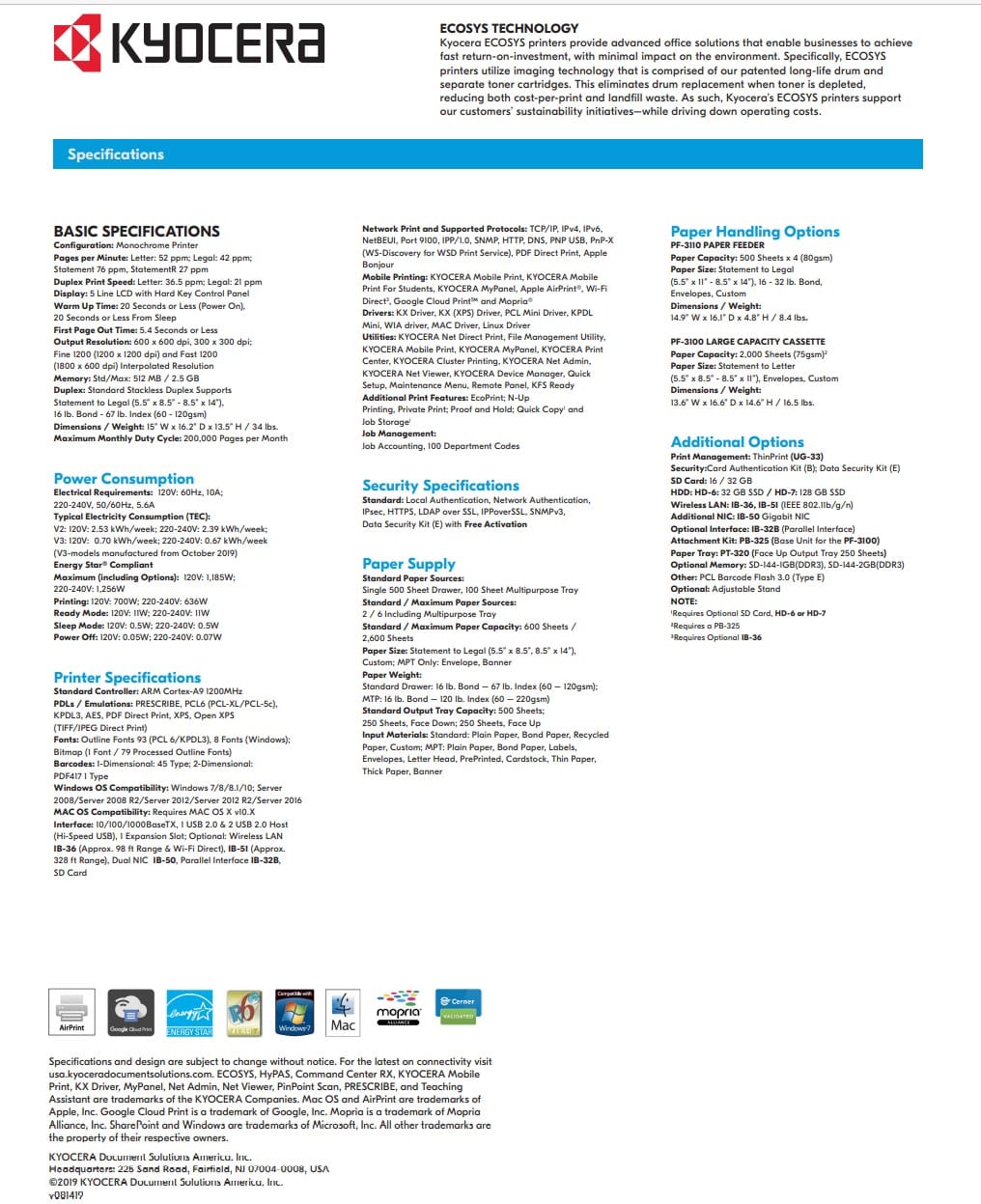 Add up to 4 of the PF-3110 Sheet Feeder (500 sheets per drawer), or the PF-3100 (2000 sheets) for those big print jobs. The TK-3172 Black Toner produces up to 15,500 prints. Go wireless with an IB-36 (about 98 feet range) or go big with the IB-51 with an estimated 328 feet range. She the specification sheet for even more accessories from the KyoceraStore.com – you’ll be glad you did!