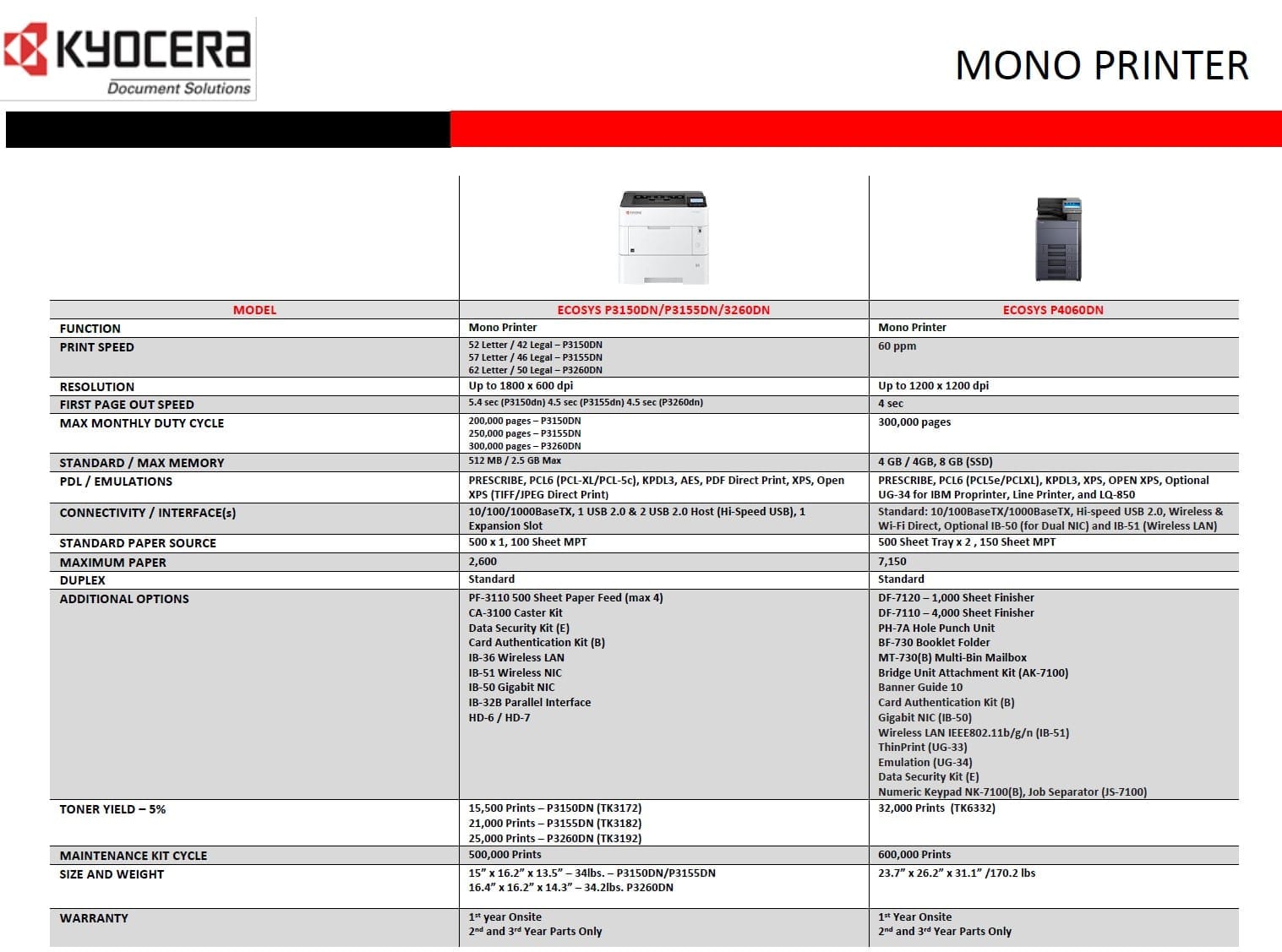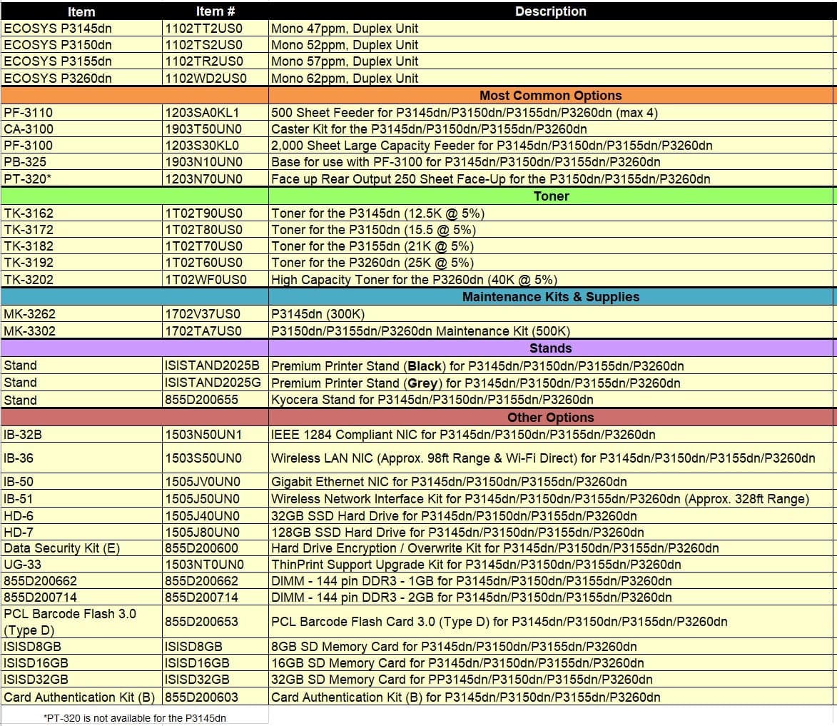 The is a workhorse of printers. Made for speed and high-volume printing with low per page cost. Add up to 4 extra sheet feeder drawers (PF-3110) holding 500 sheets each or one massive drawer that holds 2000 sheets (PF-3100). Set it to print and work on the next big project while this prints away. The TK-3182 Black Toner has the ability to print up to 21,000 pages before it runs out of toner. Need to know who or what is printing at the Data Security Kit (E) done via a downloadable software piece. Let the KyoceraStore.com configure your new P3155dn today! As always shipping is free!