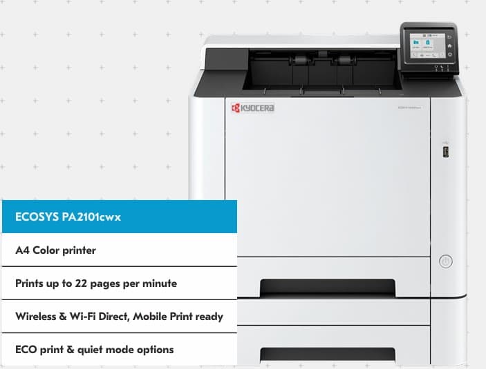 The ECOSYS PA2101cwx is a durable, energy-efficient A4 color printer designed for remote professionals, small businesses, and home office users who demand speed, reliability, and professional output. With advanced connectivity options including built-in wireless and Wi-Fi Direct®, cloud printing support, and a high-yield toner system, this compact printer delivers performance in a minimal footprint. Engineered with Kyocera’s commitment to sustainability and long-life components, it supports smooth integration into any work environment.