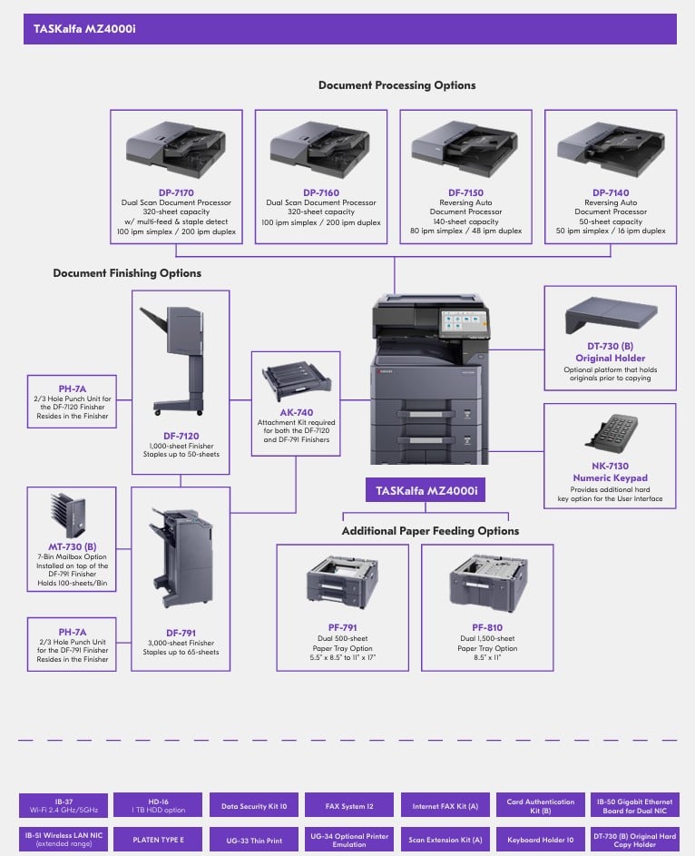 The Kyocera TASKalfa MZ4000i is a feature-rich multifunction printer designed to enhance office productivity and deliver reliable, professional-grade performance. Its robust security, eco-friendly design, and versatile media support make it an excellent choice for medium to large workgroups.